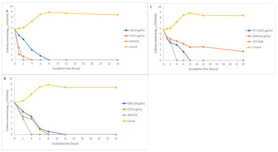 Time–kill curves for antimicrobials in combination at various minimum inhibitory concentration (MIC) values against multidrug-resistant MDR C. freundii. (A,B) The combination of colistin at MIC in combination with ceftazidime and gentamicin against isolates C2 and C4, respectively. (C) Drug combination between gentamicin and tetracycline against isolate C4.