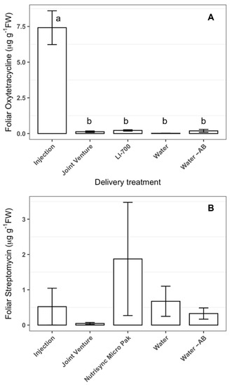 - Li, J.; Kolbasov, V.G.; Lee, D.; Pang, Z.; Huang, Y.; Collins, N.; Wang, N. Residue dynamics of streptomycin in citrus delivered by foliar spray and trunk injection and effect on “Candidatus liberibacter asiaticus” titer. Phytopathology 2021, 111, 1095–1103. [Google Scholar] [CrossRef]