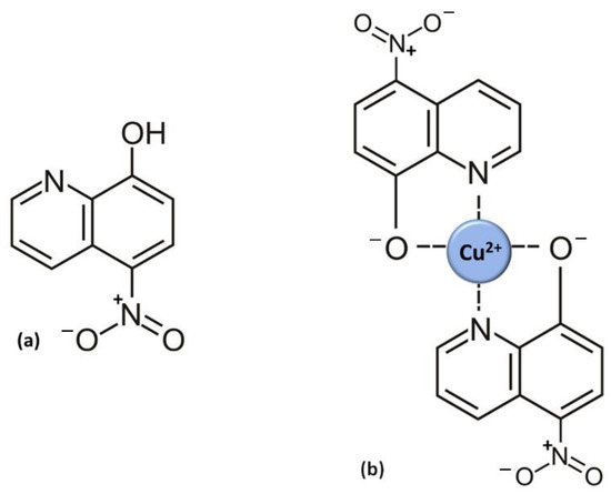 (a) Structure of nitroxoline (5-nitro-8-hydroxyquinoline, NIT); (b) example of NIT−Cu2+ chelate, showing two possible chelating sites.