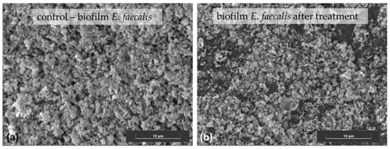 SEM images of E. faecalis on urinary catheter surface (a) before and (b) after nitroxoline treatment, showing the areas of biofilm destruction. Samples were coated with Pd before analysis on a Hitachi S–3600N Scanning Electron Microscope. Image taken at 13.3 k magnification (scale bar represents 10 μm).