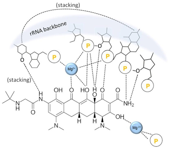 The role of chelation in the MOA of TCs is intricate and fascinating [37,39,92]. In order to diffuse through the bacterial cell membrane, a TC molecule has to be fully protonated; the Mg-chelate cannot enter the cell. Which of the two will be a dominant form is determined by pH and Mg2+ concentration: higher pH and higher Mg2+ concentrations favor the Mg-chelate form [37,39]. Both pH and Mg2+ concentrations are higher inside the bacterial cell, and this pH difference is the driving force of the TC uptake (transport proteins are obsolete) [39]. Hence, when the fully protonated TC enters the bacterial cell, it encounters a milieu that shifts the equilibrium towards Mg-chelate, which is not able to escape the cell. It has been shown that only in the form of an Mg-chelate is a TC molecule able to inhibit bacterial growth, by binding to the bacterial 30S ribosomal subunit. In particular, the TC molecule binds with its hydrophilic side to phosphate group oxygens of the rRNA backbone both directly and via Mg2+ ion(s) [42,93,94,95], as shown by the example of tigecycline in Figure 4.