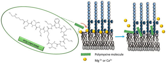 Surprisingly, polymyxins’ MOA is still a subject of debate [56], but generally, it is accepted that the bacterial membrane is the primary target. The Gram-negative bacterial membrane comprises lipopolysaccharides (LPS), phospholipids, proteins, lipoproteins, etc. LPS are polyanionic molecules, and as a result, an accumulation of negative charges occurs in the lipid A and core oligosaccharide regions. The repulsive forces between negative charges are counterbalanced by the bridging Mg2+ and Ca2+ cations, and this chelation is crucial for the integrity of the bacterial outer membrane (Figure 8) [60,122]. One of the relevant models of MOA proposed that the first step in polymyxin’s destruction of the membrane is the displacement of Mg2+ and Ca2+ cations by the polymyxin molecule, which has at least three-fold higher affinity to LPS compared to native Mg2+ and Ca2+. The disruption of Mg2+/Ca2+-LPS chelates and the insertion of bulky polymyxin molecules instead results in the “crack” formation that allows for the passage of other molecules, among which are the other polymyxins. The insertion expands and weakens the membrane, finally resulting in the destruction of the physical integrity of the membrane [55,56,57,58,59]. Thus, in the case of polymyxins, chelation is not done by them, but the disruption of native chelates present in bacterial membranes represents the core of their MOA.
