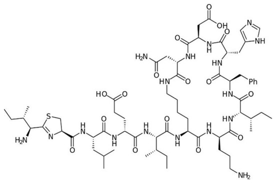 Polymyxins are the products of different species of the genus Bacillus and are currently used as a last resort defense against difficult multidrug-resistant pathogens. They were discovered as early as 1947. In 1948, a Washington newspaper wrote “Time will tell, however, whether polymyxin will work in human beings” [120]. Indeed, time told a very dramatic story: at first, they were considered “miracle” antibiotics, but soon they were infamous due to nephrotoxicity. In modern times, similarly to nitroxoline, they have experienced a renewed clinical interest due to rising bacterial resistance [56,57,121].