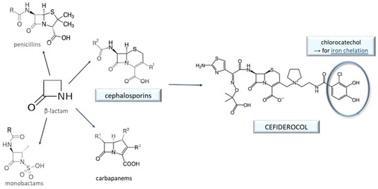 Classification of the β-lactam antibacterials. Cefiderocol, a member of the cephalosporin subgroup, contains a catechol moiety that enables it to chelate Fe3+ ions and thus use the bacterial ferric ion transport system to enter the bacterial cell (the Trojan horse approach).