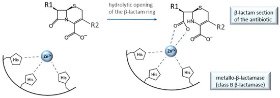 Other β-lactam antibacterials achieve their bactericidal activities by inhibiting an enzyme involved in bacterial cell wall synthesis. Concretely, they act as a “suicide substrate” to penicillin-binding proteins (PBPs) by covalently binding to PBPs serine residue [131]; thus, their MOA does not include chelation. They are one of the most successful classes of antibiotics, but their overuse brought about bacterial resistance on an alarming scale. Bacteria have developed multiple resistance strategies, one of which is the production of the enzymes β-lactamases. This family of enzymes hydrolyses the C–N bond within the β-lactam ring (Figure 12) and thus inactivates the antibiotic. There are four classes of β-lactamases (A, B, C, and D), among which class B lactamases are recognized as a particular clinical threat due to the fact that they cannot be inactivated by clinically useful inhibitors and are extremely promiscuous [71,132]. What distinguishes the class B lactamases from the other three classes is the fact class B uses chelation to destroy antibiotics’ β-lactam ring, while the classes A, C, and D employ covalent bonding through the active site serine. Class B are thus metallo-β-lactamases (MBLs), while classes A, C, and D are referred to as serine-β-lactamases [133]. Chelation in class B is done via (one or two) Zn2+ or other metal cations [70,71], as shown in a simplified manner in Figure 12.