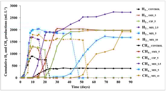 A wide range of effects from complete inhibition to stimulation of CH4 production, depending on the antibiotic types and concentrations, was previously observed by other authors [7,9,27]. The aforementioned study by Mazzurco Miritana and colleagues [33] showed that the addition of SMX (5 mg L−1) to cattle manure resulted in higher CH4 production compared to the control condition. A similar result was reported by Zhi and Zhang [27] who observed that the addition of 100 mg L−1 of CIP to cattle manure stimulated CH4 production. Even in this study, the addition of antibiotics stimulated CH4, as well as H2 production, highlighting that these results need further investigation to be fully understood. In particular, it needs to be verified whether antibiotics, in this case CIP, exerted selective pressure on specific functional components of the microbial community, probably competing with methanogens for the use of H2 (i.e., bacteria performing sulphate reduction and/or homoacetogenesis).