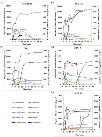 Organic acids and ethanol concentrations in the different conditions (a–e) during the anaerobic digestion process compared with H2 and CH4 production (black dotted and solid lines represent H2 and CH4 production, respectively). The standard deviations are <10%.