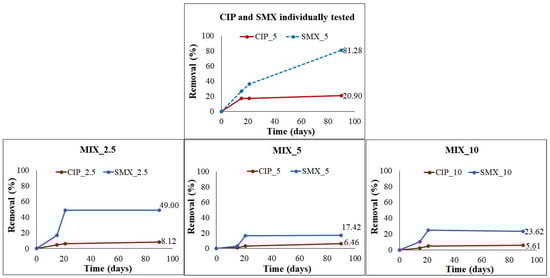 CIP alone (i.e., CIP_5) degraded three times less when combined with SMX in MIX_5, showing 20.9% and 6.5% removal, respectively. This difference, observed in tests conducted with the same final antibiotic concentration, is attributable to the synergism generated by the different mechanisms of action exerted by the two antibiotics investigated on microorganisms. The lowest and highest concentrations of antibiotic mixtures, i.e., MIX_2.5 and MIX_10, showed the highest (8.1%) and lowest (5.6%) CIP removal, respectively. In any case, CIP removal never exceeded 21%, confirming this antibiotic to be a recalcitrant compound in natural and artificial ecosystems, as reported by other authors [15,18,25]. SMX was degraded more easily than CIP. A percentage of 49.0% of its removal was reached in MIX_2.5, but its degradation was also strongly negatively influenced by the co-presence of CIP. Indeed, Mazzurco Miritana et al. [33] observed that SMX alone was removed 81% at the end of their experiment. Some aspects remain to be clarified concerning the role of SMX in the mixtures. Indeed, at the end of the experiment, Mix_10 produced more CH4 than Mix_5 (Figure 1), in line with the removal rates (Figure 3). On the other hand, SMX_5 produced CH4 faster than CIP_5, since the production plateau was reached at days 22 (SMX_5) and 40 (CIP_5), showing a lower effect on the microbial community of SMX than that of CIP.