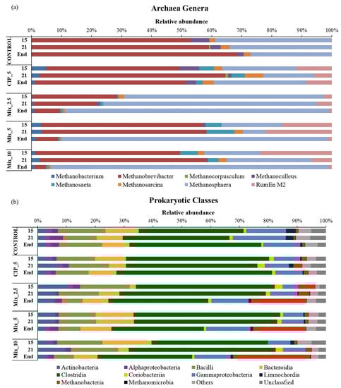(a) Relative abundance of Archaea genera in all experimental conditions evaluated by NGS at genus level and (b) relative abundance of prokaryotic cells in all experimental conditions evaluated by NGS at class level.