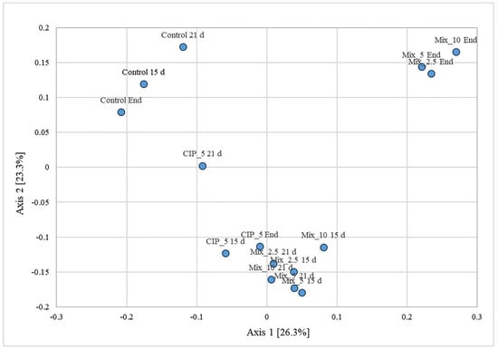 In particular, the controls were different from the MIX conditions at the end of the experiment and of the other conditions (i.e., MIX conditions at 15 and 21 days and the CIP_5 at 15 and 21 days). The CIP_5 at day 21 was in the middle, between the control group and the other condition group.