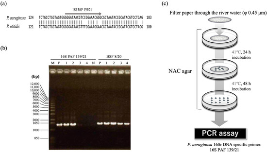 Schematic of the isolation method for P. aeruginosa from the environment. (a) Surrounding sequence of the 16S rDNA to which the primer, 16S PAF 139/21, binds, and sequence of 16S rDNA sequences of P. aeruginosa and P. otitidis. (b) Electrophoresis diagram of DNA fragment amplified with primer set, 16S PAF 139/21(or BSF 8/20) and BSR 1541/20 against genome DNA of P. aeruginosa and P. otitidis. Lane M: 1 kb ladder; lane P: P. aeruginosa PAO1S; lanes 1 and 2: P. aeruginosa isolated from the river in this study; lanes 3 and 4: P. otitidis isolated from the river in this study. (c) The flow of the process and cultivation conditions using NAC agar.