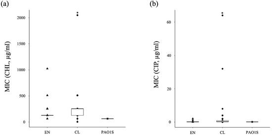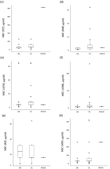 Graphical presentation of the results of antibiotic susceptibility of the strains in Tables S2 and S3. ▲: the strains isolated from the environment, EN-001-050, Table S2. ●: the strains isolated from clinical settings, CL01-42, Table S3. ■: PAO1S, which is the standard strain of P. aeruginosa. *: the MIC is equal to or higher than that concentration. (a) CHL, chloramphenicol; (b) CIP, ciprofloxacin; (c) TET, tetracycline; (d) IPM, imipenem; (e) ATM, aztreonam; (f) AMK, amikacin; (g) RIF, rifampicin; (h) MIN, minocycline.