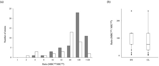 The ratio distribution of adherent bacteria MBCAD/MICAD. (a) The number of strains each ratio (MBCAD/MICAD). The gray bar represents the number of strains isolated from environment, EN-001-050, and the white bar represent the number of strains isolated from clinical setting, CL01-42. In the total number of 42 clinical strains, nine strains that exhibit resistance to imipenem were excluded. (b) The results were represented as a box plot to compare the MBCAD/MICAD ratio of environmental and clinical strains. ▲: the strains isolated from the environment, EN-001-050, Table S4. ●: the strains isolated from clinical settings that nine strains that exhibit resistance to imipenem were excluded, CL01-42, Table S5.