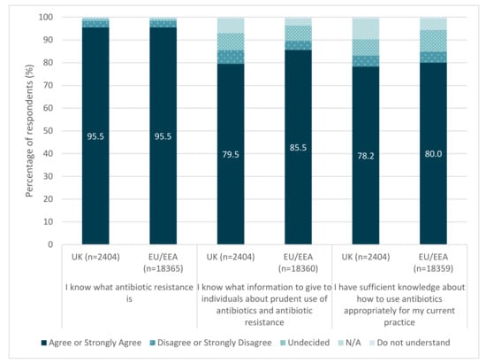 - European Centre for Disease Prevention and Control & Public Health England. Survey of Healthcare Workers’ Knowledge, Attitudes and Behaviours on Antibiotics, Antibiotic Use and Antibiotic Resistance in the EU/EEA; European Centre for Disease Prevention and Control: Stockholm, Sweden, 2019. [Google Scholar]