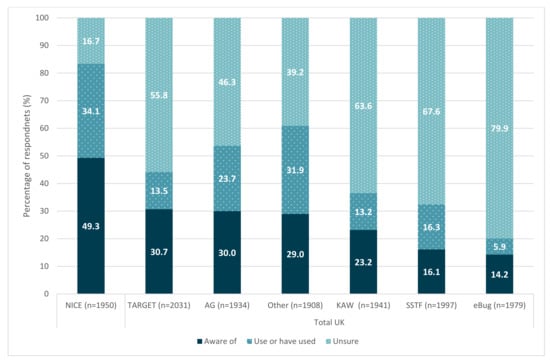 Fifty-eight percent of UK respondents were aware of the National Action Plan (Figure 3). Less than half of respondents were aware of either EAAD (46% aware) or WAAW (45%), and approximately 30% felt that national campaigns had been effective. Respondents in the UK were mostly undecided (55%) on the campaign’s effectiveness. Comparative data for the EU/EEA is available in Supplementary Figure S9. Focusing in on the UK constituent countries, participants from England agreed the most that national campaigns are effective (32%), whereas participants from Northern Ireland disagreed the most (24%) (Supplementary Figure S10).