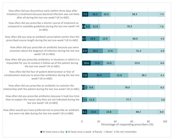 In total, 59% of UK respondents had prescribed, administered or dispensed antibiotics at least once in the previous week (Supplementary Table S9), while almost 14% of the UK participants had not prescribed, administered or dispensed any antibiotics.