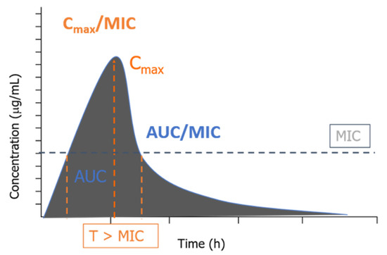 When combining the pharmacodynamic (MIC) and kinetic parameters described above (Cmax and AUC), the PK/PD indices appear (Figure 1), created to evaluate the efficacy and optimize the therapeutic regimens [15].