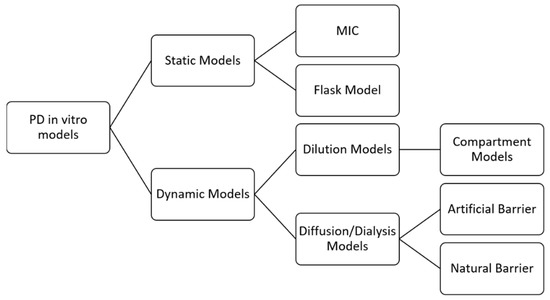 In vitro PD models represent one of the pillars in the conduct of PK/PD studies, and several have been developed to allow the study of death curves. The models are divided into static and dynamic models, with each type having different characteristics. Static models are easier to obtain; they present constant concentrations throughout the observed time but do not allow changes in drug or culture medium nor for measurement of post-antibiotic effects. On the other hand, the dynamic models apply changes in the concentration of the drug, which allows an extension of the observed period from 24 h to more than 72 h, if necessary. It is thus possible to measure single and multiple doses [39]. Figure 2 shows the classification of the in vitro models: