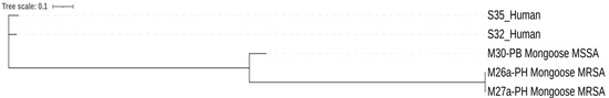 MSSA were included in this study as we performed a non-selective isolation aim to investigate the diversity of S. aureus in the samples. Apart from a single MSSA ST5 we found two MSSA strains with a ST, ST7434, belonging to CC30, which is commonly found in humans but also in several animal species including marmots, camels, pigs, white stork and Portuguese buzzard [9]. It remains unclear whether ST7434 is specifically associated with mongooses as two very similar strains from different neighborhoods were isolated.
