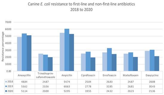 The first- and non-first-line antibiotic antimicrobial resistance pattern has a significant implication regarding clinical empirical use [19]. Between 2018 and 2020, feline E. coli resistance against the first-line antibiotic amoxicillin increased from 44.4 to 49.0%, while trimethoprim-sulfamethoxazole resistance remained the same. In the same period, feline E. coli resistance against the non-first-line antibiotic quinolones ciprofloxacin, enrofloxacin, marbofloxacin, and doxycycline increased by 3%, 5%, and 2%, respectively (Figure 1). In 2018, the canine baseline E. coli resistance against first-line antibiotics was higher than in feline patients. During this period, canine E. coli resistance against first-line amoxicillin increased by 3%, while trimethoprim-sulfamethoxazole reduced by 5%. In the same period, canine E. coli resistance against the non-first-line antibiotic quinolones ciprofloxacin, enrofloxacin, marbofloxacin, and doxycycline reduced by 5%, 2%, 4%, and 7%, respectively (Figure 2).