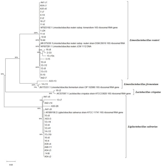 Lactobacilli strains (n = 48) were chosen according to their high anti-Salmonella activity in the spot-on-lawn test. The 16S rRNA gene sequence analysis identified four species: Limosilactobacillus reuteri (formerly Lactobacillus reuteri) (n = 22, 45.83%), Ligilactobacillus salivarius (formerly Lactobacillus salivarius) (n = 20, 41.66%), Limosilactobacillus fermentum (formerly Lactobacillus fermentum) (n = 2, 4.16%) and Lactobacillus crispatus (n = 1, 2%) (Figure 1). The three remaining isolates (16/i10, 14/i15, A30/c2, 6.25%) were non-typable. The most common species were Limosilactobacillus reuteri and Ligilactobacillus salivarius. The phylogenetic tree demonstrated a close relation among the same species. However, we could not obtain a better strain resolution at the subspecies level among Limosilactobacillus reuteri. To gain further insight into the genetic dissimilarities and evolutionary relationships among the lineages isolated here would require profound core-gene-based phylogenetic analyses. These analyses are not considered here, since the focus of our study is the probiotic potential of lactobacilli strains.