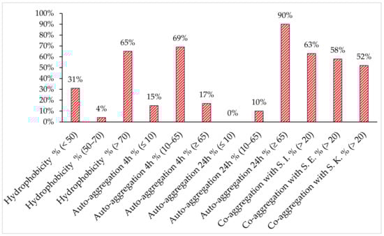 Isolate distribution in defined ranges of percentage of hydrophobicity, auto-aggregation and co-aggregation with the three Salmonella spp. (S. Enteritidis (S.E.), S. Kentucky ST198 (S.K.) and S. Infantis (S.I.).