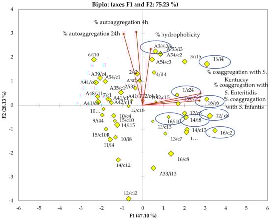 Graphic representation of the principal component analysis (PCA) of surface proprieties, including hydrophobicity and auto/co-aggregation, for the 48 lactobacilli isolated stains. The selected stains are encircled.