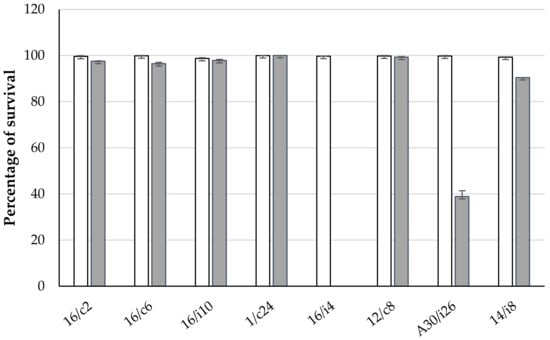 Effects of simulated gastrointestinal conditions on lactobacilli viability. White and grey columns correspond to lactobacilli subjected to 0.15% and 0.3% bile salts, respectively. L. crispatus 16/c2, Ligilactobacillus salivarius (16/c6, 16/i4, A30/i26, 14/i8), Lactobacillus sp. 16/i10 and Limosilactobacillus reuteri (1/c24 and 12/c8).
