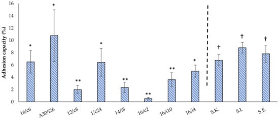 Adhesion capacities of the eight-native poultry-derived lactobacilli strains and the three Salmonella serotypes (S. Kentucky ST 198 (S.K.), S. Infantis (S.I.) and S. Enteritidis (S.E.)) to Caco-2 monolayers. The means and standard deviations of the two independent experiments are shown, each with three replicates. The differences between the levels of strain adhesion were evaluated separately for the lactobacilli strains and Salmonella serotypes. Ligilactobacillus salivarius 16/c6, 16/i4 and A30/i26 and Limosilactobacillus reuteri 1/c24 revealed no significant differences (*) in their adhesion capacity, a finding which was dissimilar from the four remaining tested strains (**). The differences in the adhesion capacities of S. Enteritidis, S. Infantis and S. Kentucky ST198 were also not significant among the three serotypes (†).