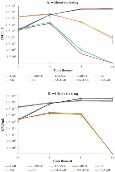 In both experiments, without (Figure 7 A) or with (Figure 7 B) vortexing, differences in the CFUs between the control cultures of Salmonella (S.E., S.K., and S.I.) and co-cultures (S.E./LAB, S.K./LAB and S.I./LAB) were observed from the early incubation hours. However, the numbers of CFUs estimated from the co-cultures without vortexing were lower than those determined from the vortexed co-cultures and those of the control cultures at 8 h. In fact, the Salmonella in the co-cultures increased from 105 to 106 CFU /mL in the first 4 h and then sharply decreased to 102 and 101 CFU/mL, until a negligible cell viability was obtained between 8 h and 24 h. Simultaneously, the Ligilactobacillus salivarius count decreased from 107 to 106 at 8 h, then was reduced to almost 104 at 24 h in the monoculture (16/c6) and co-cultures (LAB/S.E., LAB/S.K and LAB/S.I.).