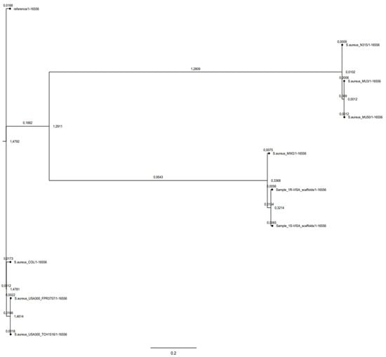 CSI phylogeny clearly showed the clusterization of 1-S and 1-R MRSA strains in the USA-400 CA-MRSA phylogenetic lineage. The phylogenetic tree showed a close relationship between the 1-S/R MRSA strain pair and the ST-1 MRSA cluster. This highlighted the strong phylogenetic and genomic relationship with the MW2 CA-MRSA, notoriously a USA400, agr-III, CA-MRSA prototype (Figure 1).