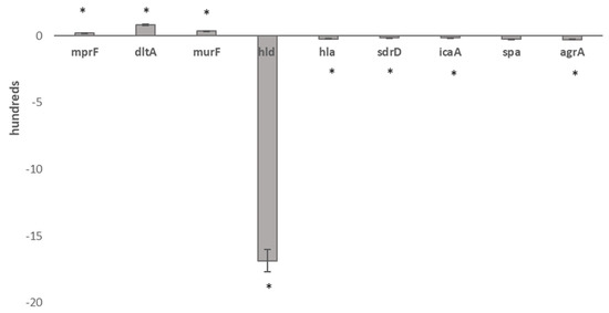Real-time qPCRs of the set of characterizing transcripts, murF, hld, hla, dltA, mprF, spa, agrA, icaA and sdrD, clearly confirm the expression trends found in RNA-seq transcriptional data outputs (Figure 2).