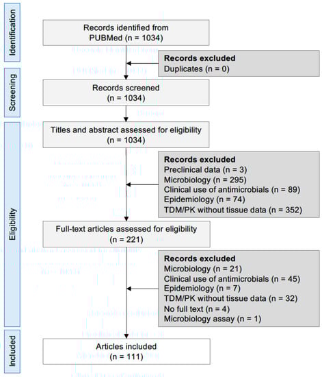 The search of articles resulted in 1034 articles, of which 111 remained according to the inclusion/exclusion criteria, as depicted in Figure 1. An additional 16 articles describing tissue penetration in individuals other than ICU patients are included in the text. In the following sections, the tissue penetration of antimicrobials acting on the cell membrane and bacterial wall is described, taking as reference the corresponding plasma concentrations. Additional information regarding the attainment of PK/PD targets at the administered doses is included in the text.