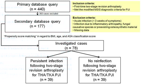 The remainder of the potential cases for investigation were assembled by propensity score matching in regard to BMI, age, and ASA classification score, and the final sample consisted of 78 subjects: 39 patients with a reinfection (criteria see below) and 39 controls of total hip (THA) and total knee arthroplasties (TKA) who met the modified Musculoskeletal Infection Society (MSIS) diagnostic criteria for PJI [30], with a follow-up time of 29 months and complete serology reports throughout the whole treatment protocol.