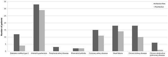 Bar diagram showing number of infection-free and reinfected patients’ comorbidities.