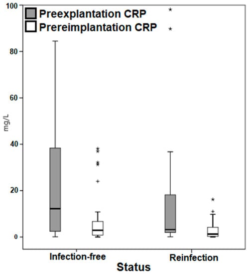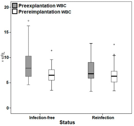 Patients who remained infection-free had higher mean CRP and WBC than patients who became reinfected in both the preexplantation (45.4 versus 18 mg/L and 8.6 versus 7.5 × 109/L, respectively) and prereimplantation (11.1 versus 2.8 mg/L and 6.6 versus 6.5 × 109/L, respectively) time points (Table 2). Even though equal variances were assumed (p < 0.05) when using Levene’s test for equality of variances, Student’s t-test demonstrated no statistically significant difference (p = 0.071) in the mean WBC values of reinfection and infection-free groups. Furthermore, the mean CRP values of reinfection and infection-free groups were found to be not statistically significantly different (p = 0.69).