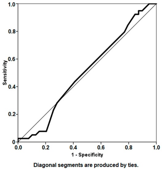 The mean interim interval between explantation and reimplantation in the entire study cohort was 13.7 weeks. Mean time to reimplantation was 13.6 (SD ± 4.7) weeks in the group of patients who remained infection-free compared to 13.8 (SD ± 5.6) weeks in the group of patients with persistent infection. Although a highly significant correlation was found between the interim interval and infection persistence (r = 0.655, p < 0.01), no significant correlation was found between interim interval and ∆CRP (r = 0.207, p = 0.071) or ∆WBC (r = 0.103, p = 0.374) with regard to infection status. Analysis using the ROC curve failed to highlight a specific threshold time to reimplantation above which patients are at significantly higher risk for reinfection (AUC = 0.507) (Figure 5).