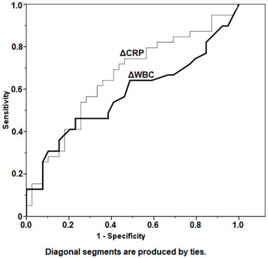 Depiction of change (∆) of CRP and WBC values between the two selected time points: preexplantation and prereimplantation, using receiver operator curves. CRP, C-reactive protein; WBC, white blood cell count.