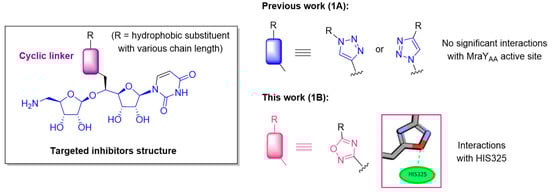 Several families of natural MraY inhibitors are known, notably the widely represented one of peptidonucleosidic antibiotics, such as liposidomycins [,,], muraymycins [] and caprazamycins [,]. All of these compounds share a common aminoribosyl uridine scaffold that has been shown to be important for their biological activity [,,]. The synthesis of the simplified analogs of these complex natural compounds [,,,] retaining antibacterial activity is a challenge, and significant progress towards this goal has been made [,,,,,,,]. The crystallographic structure of MraY from Aquifex aeolicus (MraYAA) in complex with several ligands has been solved (muraymycin D2 (MurD2, PDB: 5CKR) [] and carbacaprazamycin (PDB: 6OYH) []), permitting the S. Y. Lee group to define several hot spots (HS) of the priviledged interaction of the co-crystallized inhibitors with the MraY active site []. We also developed the synthesis of several series of inhibitors based on this aminoribosyl uridine core, the chemical diversity being introduced on the scaffold through various linkers, either cyclic such as C- and N-triazoles [,], or acyclic, such as urea [], amide, sulfonamide, squaramide or diamide []. The docking of the triazole-containing inhibitors, in either the 5CKR [] or 6OYH [] structural models of MraYAA, revealed no significant interactions of the triazole with he aminoacids of the active site (Figure 1, 1A). In the present work, considering this lack of stabilizing interaction, we decided to enlarge the panel of inhibitors with a cyclic linker. We focused on oxadiazole-containing ones because the docking of a representative of the targeted oxadiazole series, with a C10 chain as a hydrophobic substituent, showed the interaction of the oxadiazole ring with the key amino acids (H325) of the enzyme active site (Figure 1, 1B), as observed for the highly potent inhibitors carbacaprazamycin, muraymycin D2 and tunicamycin. We hypothetized that this interaction could contribute to generate more active compounds. Furthermore, a panel of hydrophobic substituents with various chain length was selected to study their influence in promoting antibacterial activity.