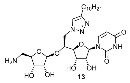 The inhibitory activity of the synthesized compounds 12a–12j was evaluated on MraY transferase purified from Aquifex aeolicus (MraYAA) prepared as previously described by Chung et al. []. Their activity (Table 4) was compared to the inhibitory activity of the N-triazole-containing inhibitor 13 (Figure 3) that we previously synthesized [] (Table 4). Commercially available tunicamycin from Streptomyces sp. was used as a positive control in the test.