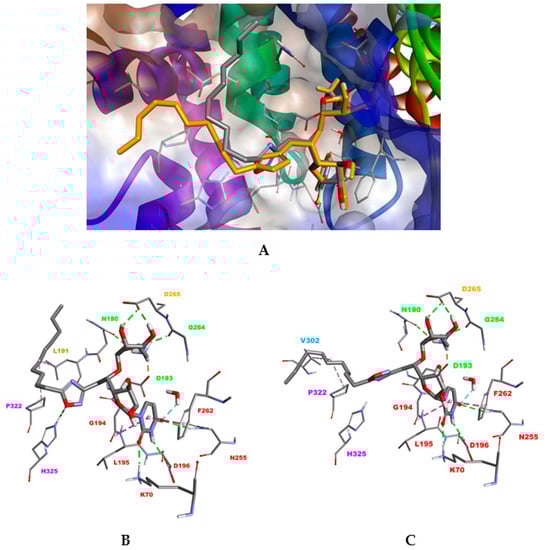 The best docking results were obtained in the open conformation of MraYAA (PDB ID: 5CKR). Although all compounds target the uridine- and uridine-adjacent pockets, as previously seen in closed conformation, significant differences were observed in the interaction network. Two possible binding conformations (I, II) were obtained for the most active compound, 12a (Figure 5A). Both are characterized by two new stabilizing interactions between the uracil moiety and residues K70 and N255 but differ in the spatial orientation of the lipophilic tail, located either in the plane of the membrane (binding mode I, Figure 5B) or exposed in the cytoplasm (binding mode II, Figure 5C). Moreover, a supplementary H-bond with the residue H325 was also predicted for the oxadiazole linker, only for binding mode I. The other compounds bind to the MraYAA active site according to the binding mode II only. For compounds 12e and 12g, the interactions network with the aminoribosyluridine part remained similar to that of compound 12a. Nevertheless, the H-bond interaction of H325 with the oxadiazole moiety was lost, reducing the stability of the compound within the binding site and consequently its activity. Interestingly, the loss of this H-bond was fairly compensated by hydrophobic contacts between the lipophilic tail and residues L191 (HS6) and F309 and between A321 (HS2) and V302 (HS4).