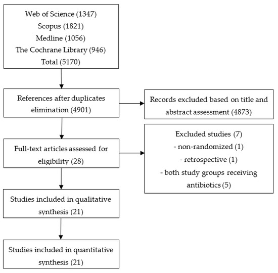 A total of 5170 references were retrieved by searching electronic databases. After erasing duplicates 4901 references remained. Twenty-eight articles were selected after screening through titles and abstracts. We selected 21 articles for inclusion according to our criteria, while 7 were excluded. A total of 21 studies with 1383 randomized patients were finally included in the analysis (Figure 1). Prophylactic antibiotics were received by 703 patients, while 680 were assessed as controls. Characteristics of included studies are shown in Supplementary Table S1.