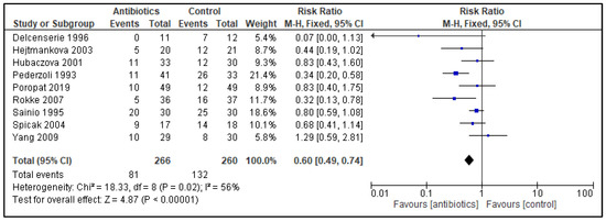 Forest plot of comparison of antibiotics versus control; outcome: all infectious complications. Infections were registered in 81 out of 266 patients receiving PAB versus a 132 out of 260 control patients, which resulted in a RR 0.60 (95% CI 0.49 to 0.74) favoring antibiotic usage, with a heterogeneity of 56%.