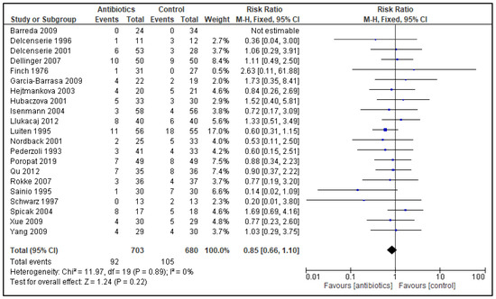 Forest plot of comparison of antibiotics versus control; outcome: mortality. Data from 21 trials showed 92 deaths occurring in the PAB group (N = 703) compared to the 105 deaths in the control group (N = 680). A RR of 0.85 (95% CI 0.66 to 1.10) and a heterogeneity of 0% confirmed no significant difference in mortality rates.