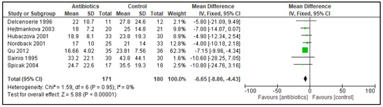Forest plot of comparison of antibiotics versus control; outcome: length of hospitalization. These data were available from seven trials with a total of 351 patients (171 vs. 180), reporting a significant shortening of the length of hospitalization, by MD −6.65 days (95% CI −8.86 to −4.43) and a heterogeneity of 0%.