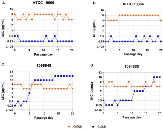 Serial passaging study with 4 A. baumannii QC strains and clinical isolates. The MIC assays were performed according to the broth microdilution method following the principles outlined in Clinical and Laboratory Standards Institute (CLSI) guidelines. During each serial passage, the contents from the well that contained the highest concentration of the compound producing visible growth during the previous day’s serial passage were sub-cultured and used to inoculate the next round of MIC panels, up to 20 serial passages. Two of the isolates tested were QC strains (ATCC 19606—panel (A); and NCTC 13304—panel (B)) and the two others were clinical isolates (1096848—panel (C) and 1094885—panel (D)). Supplementary information about the bacterial strains used in this study is displayed in Table S3.