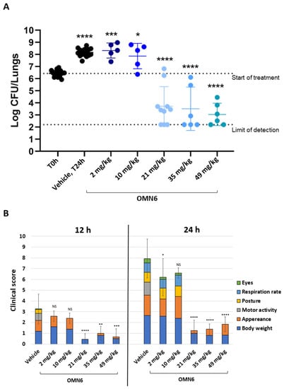 Time-course efficacy of OMN6 in a mouse lung infection model induced by an MDR AB clinical isolate. (A) Lung bacterial burden. Neutropenic CD-1 male mice were intratracheally inoculated with an MDR AB ACC000535 clinical isolate (2.7 × 106 CFU/lungs). OMN6 at a dose of 35 mg/kg, or 0.9% Normal Saline solution (Vehicle), was administered by three intravenous bolus injections, one injection per hour (timepoints T0h, T1h, T2h), starting from 2 h post-infection (timepoint T0h). The bacterial burden was determined at 8 h (T8h) and 24 h (T24h) post-start of treatment. Statistical analysis was performed by using one-way ANOVA followed by Dunnett’s post hoc test (n = 5, p values vs. T0h, * p ˂ 0.05, *** p ˂ 0.001, **** p ˂ 0.0001). (B) Clinical score. Six criteria (body weight, appearance, motor activity, posture, respiration rate, and eyes) were assessed to provide an overall clinical score of 0 to 21 (*** p < 0.001, **** p < 0.0001; according to Student’s unpaired t-test). Supplementary information about the resistance pattern of the bacterial strains used in this study is displayed in Table S5.