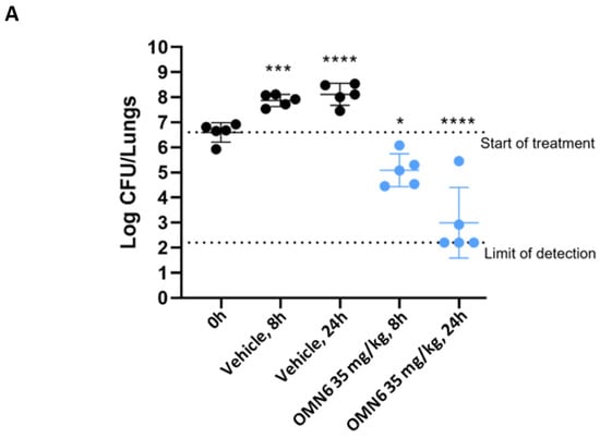 Time course of OMN6 efficacy in a mouse lung infection model. The study was performed by Evotec (Verona, Italy) with neutropenic CD–1 male mice (Charles River, Italy), weighing 18–20 g at arrival (see the previous section). On the day of infection, the bacterial challenge was prepared as previously reported. Twenty-five mice were anesthetized and intratracheally inoculated with 50 µL of the bacterial suspension corresponding to 2.7 × 106 CFU/lungs. Treatment started two hours post-infection (T = 0) and the animals were injected with three intravenous bolus injections with saline (control group, n = 10) or 35 mg/kg OMN6 (n = 10), one injection per hour (three doses × q1h). the Animals (n = 5/group/timepoint) were sacrificed by overdose of inhaled 5% isoflurane at 0 (untreated), 8, and 24 h post-start of treatment. The lungs were collected and homogenized with Cryolys® Evolution Precellys system (Bertin Instruments, Montigny-le-Bretonneux, France). Dilutions of lung homogenates were plated on Tryptic-Soy agar plates and incubated overnight for bacterial burden determination. During the study, the mice were scored for signs of infection at 12 and 24 h post-start of treatment, according to the clinical scores presented above. Statistical analysis was performed according to One–way ANOVA followed by Dunnett’s post hoc test.