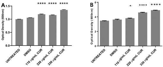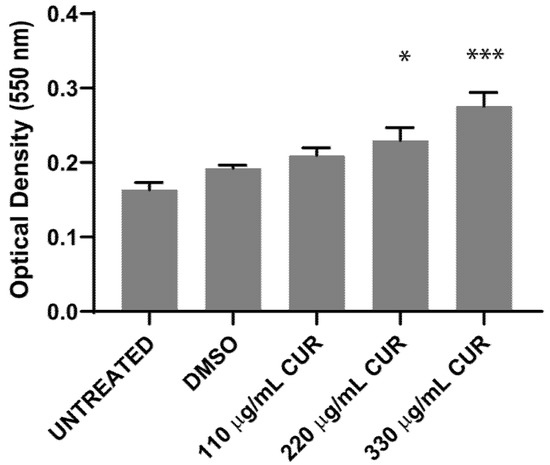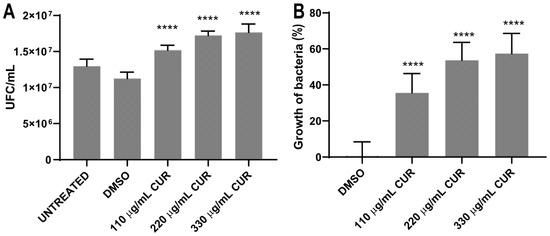 The antibacterial activity of CUR was determined by a growing strain in Luria Bertani broth (LB) (Sigma-Aldrich, Missouri, USA), at 37 °C, 250 rpm. Cultures were allowed to grow until they reached OD600 0.08 (107 colony forming units CFU/mL). Cells were pelleted by centrifugation at 1844× g for 5 min (Sigma 1-14K 12092 rotor), resuspended in 3 mL of PBS containing 110, 220 and 330 µg/mL of CUR and incubated for 2 h at 37 °C, 250 rpm. Untreated and 1.2% DMSO-treated cultures were used as negative controls. After the incubation period, cells were harvested by centrifugation, washed with PBS twice to remove the CUR, and grown in LB medium to achieve the exponential phase [18]. Bacterial growth (OD600) in LB medium was measured on a microplate reader (BioTek Synergy HT, Winooski, VT, USA). All experiments were performed in triplicate.