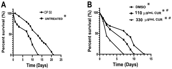 Lifespan of C. elegans infected with S. enterica ser. Typhimurium strain treated with 110 and 330 μg/mL of CUR (A). Survival curves for nematodes fed with S. Typhimurium and Escherichia coli OP50. (B) Life expectancy of nematodes fed with S. Typhimurium pretreated with DMSO, 110 and 330 μg/mL. Kaplan–Meier survival curves for S. enterica ser. Typhimurium. Survival percent are based on data from pathogenicity assay. Data were analyzed by log rank test, and all pairwise multiple comparison procedures used the Holm–Sidak method. n = 90, * p < 0.001 in relation to the OP50 and # p < 0.001 regarding the Untreated.
